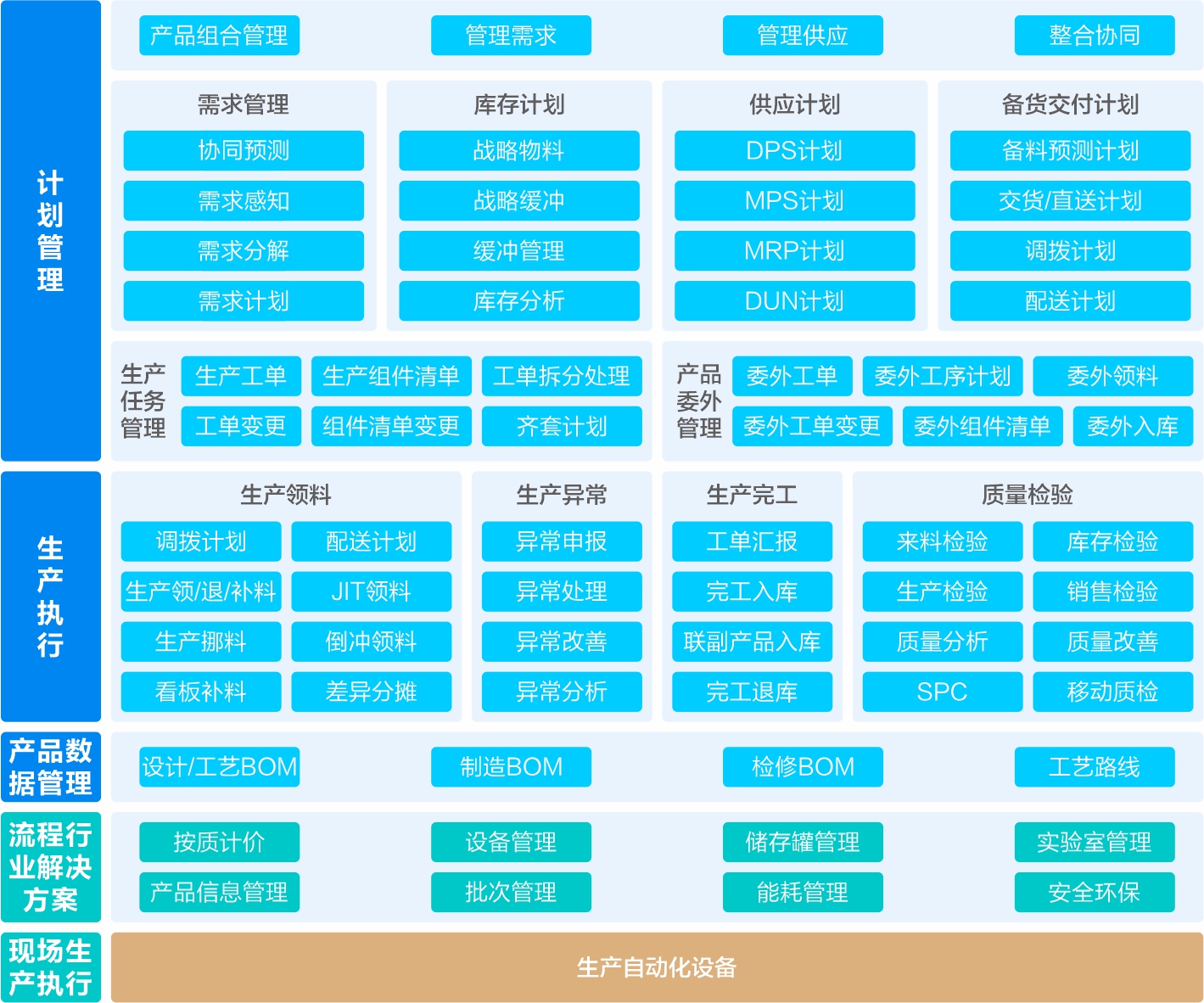 通过位于L4层级的ERP作为企业经营管理平台,聚焦于企业人财物产供销各类业务的执行与管控,以及业财一体化。位于L3层级的MES则关注日生产计划的执行、车间设备资源、执行过程的数字信息采集等,并为质量在生产环节的追溯提供数据。二者的对接主要为企业高阶生产计划与车间执行任务的对接,同时MES系统为ERP提供能耗、质检、设备管理等数据