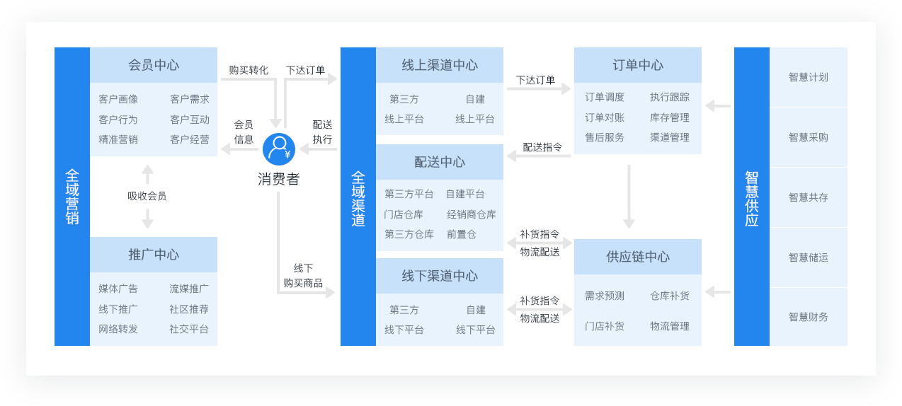 贸易零售企业需要围绕消费者,通过全域营销体系来吸引、转化、培育、沉淀、裂变消费者,打造营销一体化;通过全域渠道体系来实现全网订单、全网配送、全网预测、全网供给,通过创造消费的极致体验,打造供需一体化;通过智慧供应来实现端到端的智能高效供应体系,形成供求一体化。通过全域营销、全域渠道、智慧供应强化企业与客户之间的关系,提升商品与现金的周转。