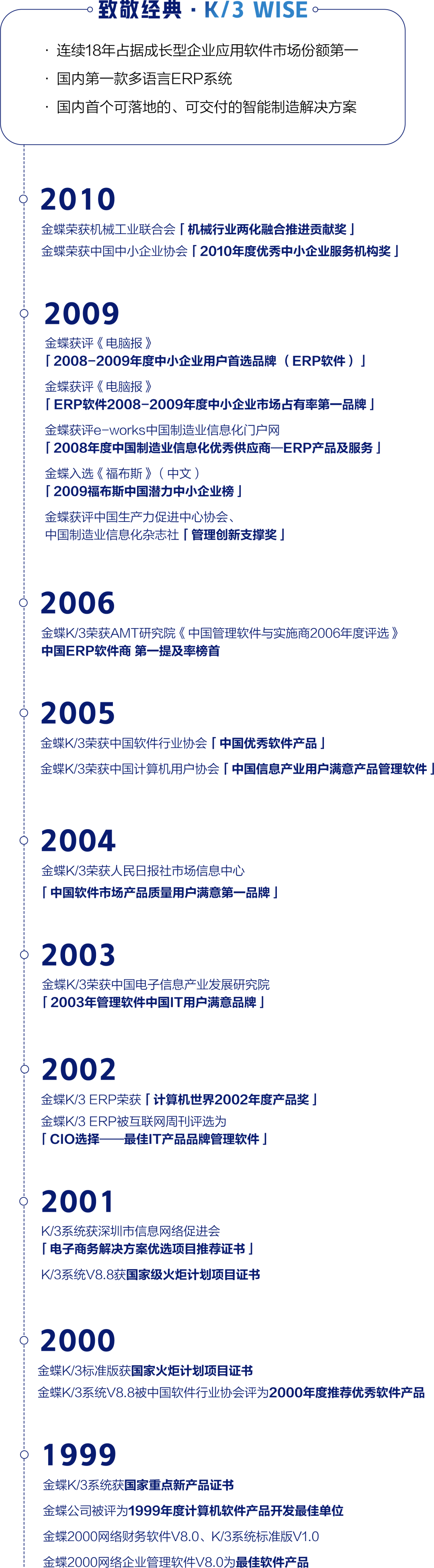 90年代,三来一补贸易在深圳的发展达到顶峰。企业在快速增长的同时,却因为技术受限而继续使用传统的管理方式。在市场渴求和民族软件使命的驱动下,1999年,金蝶K/3 ERP横空出世。这是中国第一款基于互联网平台的三层架构ERP系统,将 MRPⅡ的理论与中国管理实践相结合。可以说,K/3 WISE是国产ERP软件启航的里程碑。