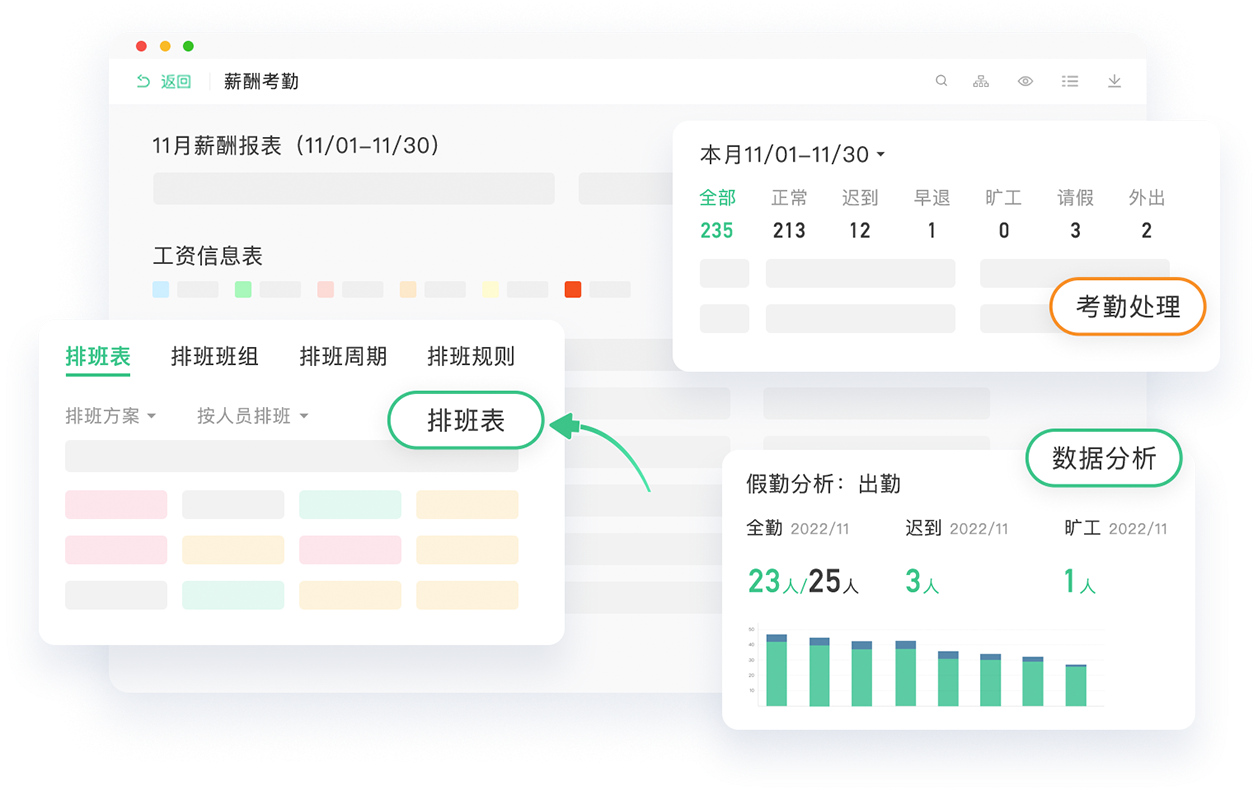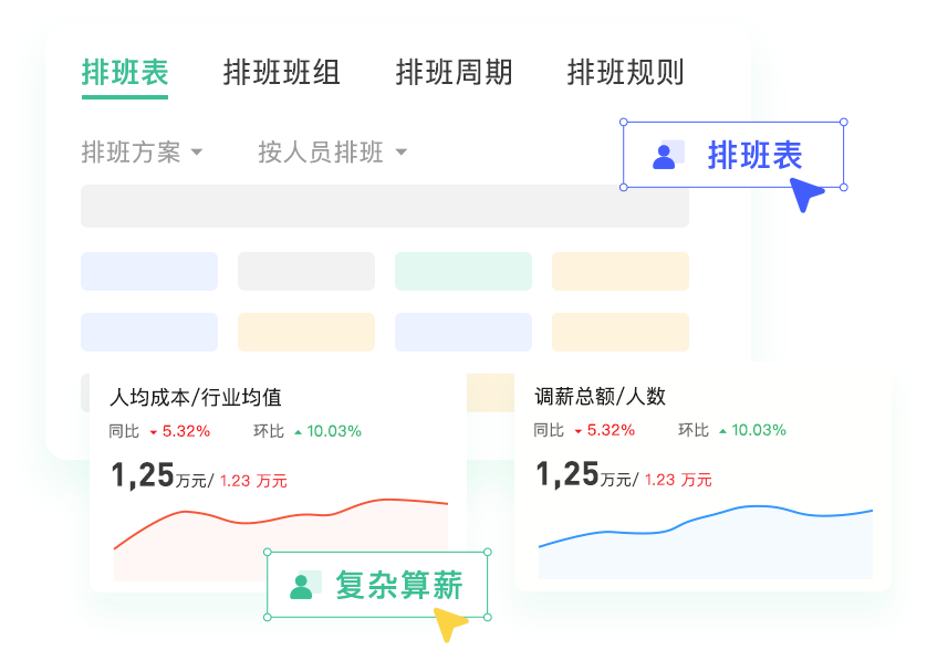 满足行业复杂场景算薪,全面落地企业薪酬体系;强大的考勤规则引擎,满足各行业假勤排班,合规用工;数据驱动的仪表盘,助力企业成本精细化管理;多场景一键算税,轻松在线申报与缴款