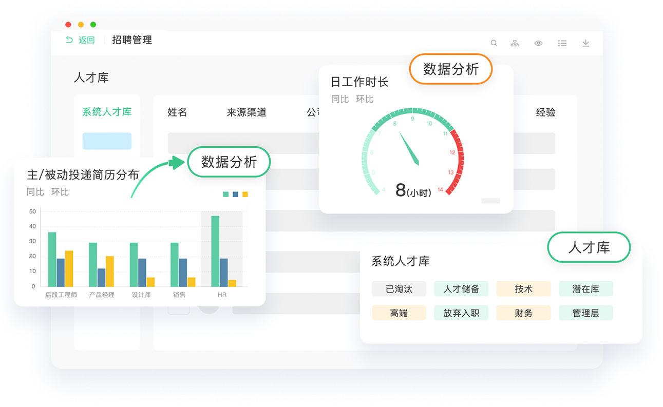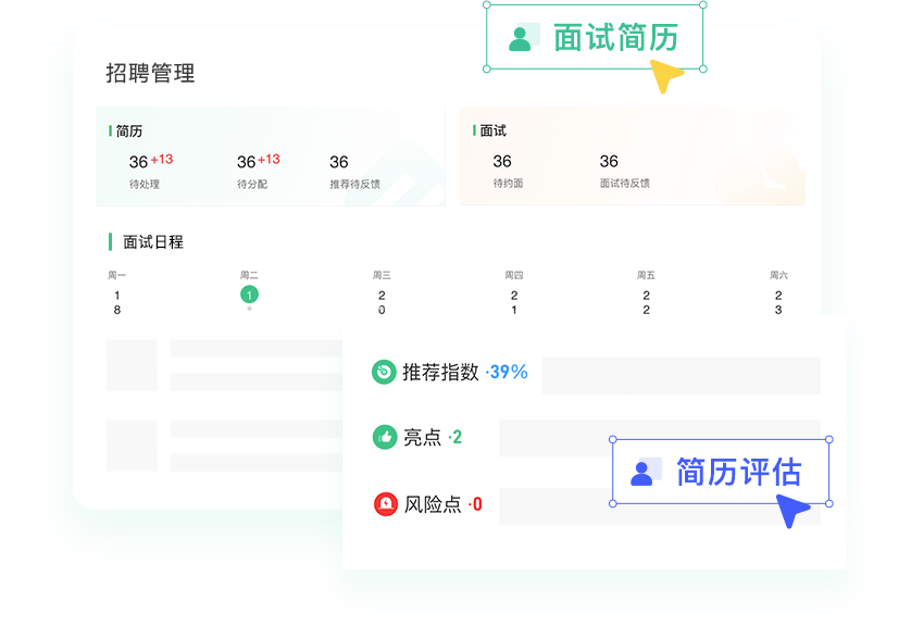 整合30+招聘平台,搭建自有招聘门户,建立雇主品牌;社招、校招、内推全覆盖,满足各行业招聘特殊场景;自动联动员工、薪酬各模块,大幅提升招聘协作效率;人工智能加持简历解析和推荐,算法助力招聘全面提效