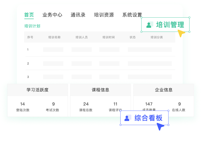 企业培训管理建设,提升企业向上力,课程多样丰富, 支持自定义课程安排,员工自助式学习形式;根据10多种培训场景、课程内容快速生成试卷,AI智能判卷,量化培训过程,反馈培训结果,实现培训效果可追踪;综合数据看板,课程效果反馈,员工能力分析,组织架构分析