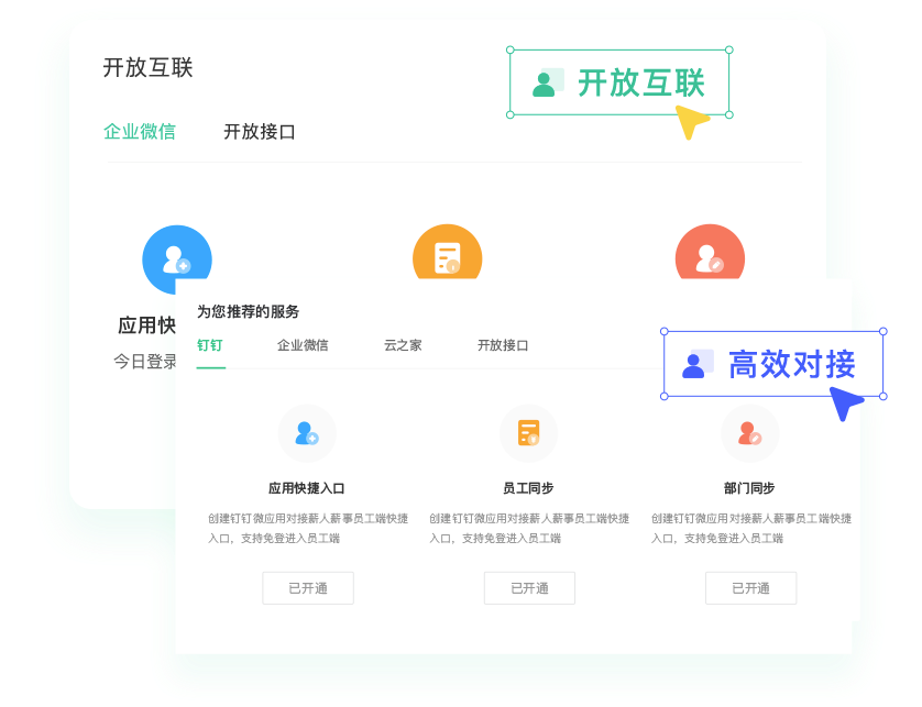 打通各IM平台,建⽴共享中⼼,告别多系统手工维护;与主流业务、财务、银行、国税平台打通,一站式办理;开放强大的API,助力高效对接自研系统