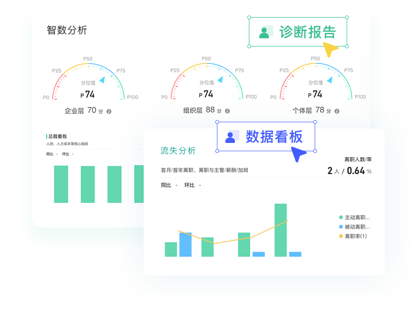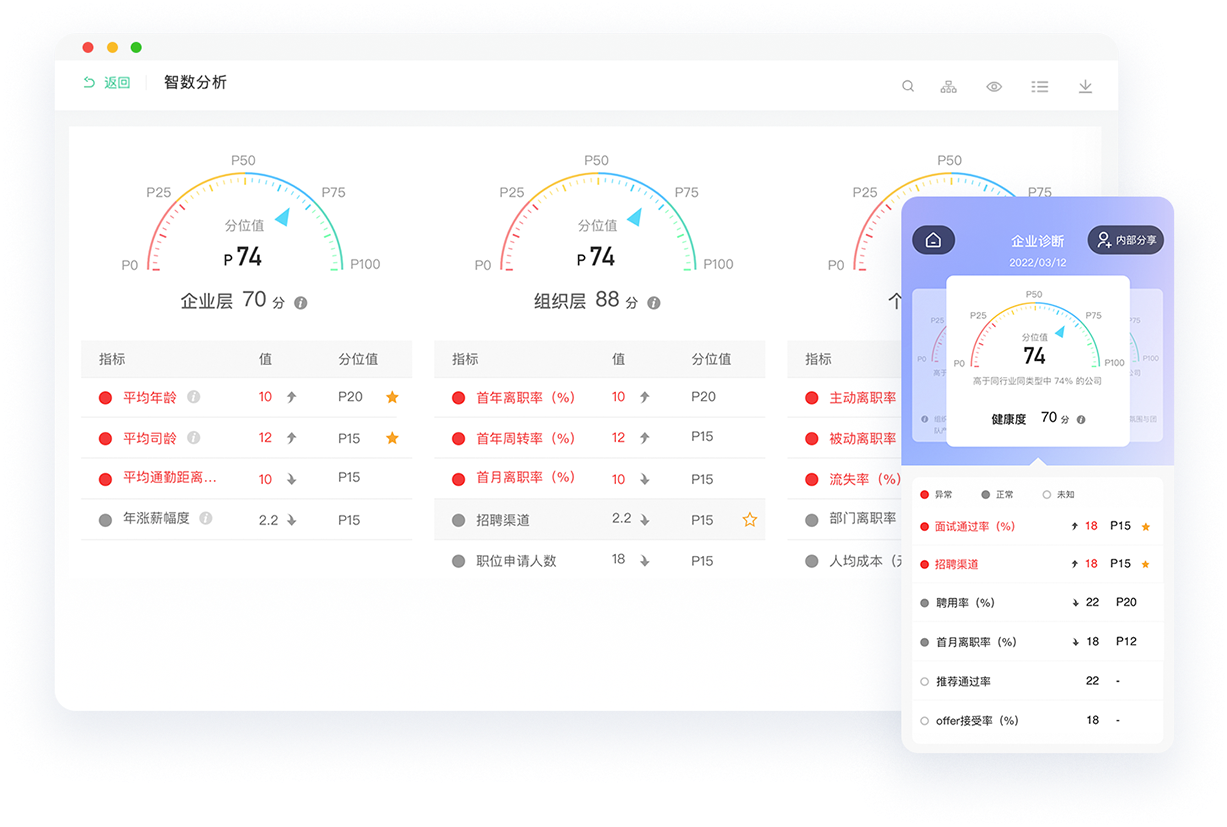 衡量人力资源健康度的51维指标,科学构建数字化体系;历史对比与行业对比,构建驱动内部增长与外部突破的Data双引擎;企业、组织、员工三层分析,认清行业分位,诊断全面;20+大项、150+数据洞察模板,助力企业改善提升人效