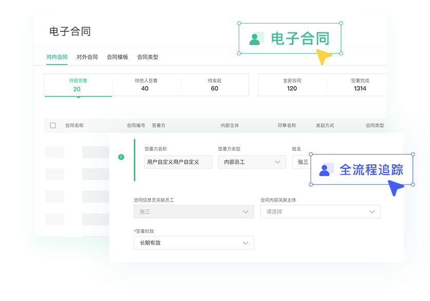 轻松建立电子合同体系,签约更便捷安全;全流程追踪,自动跟进提醒,追踪进程全面提效;数据实时变更,随用随取,合同管理合法合规