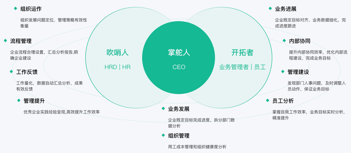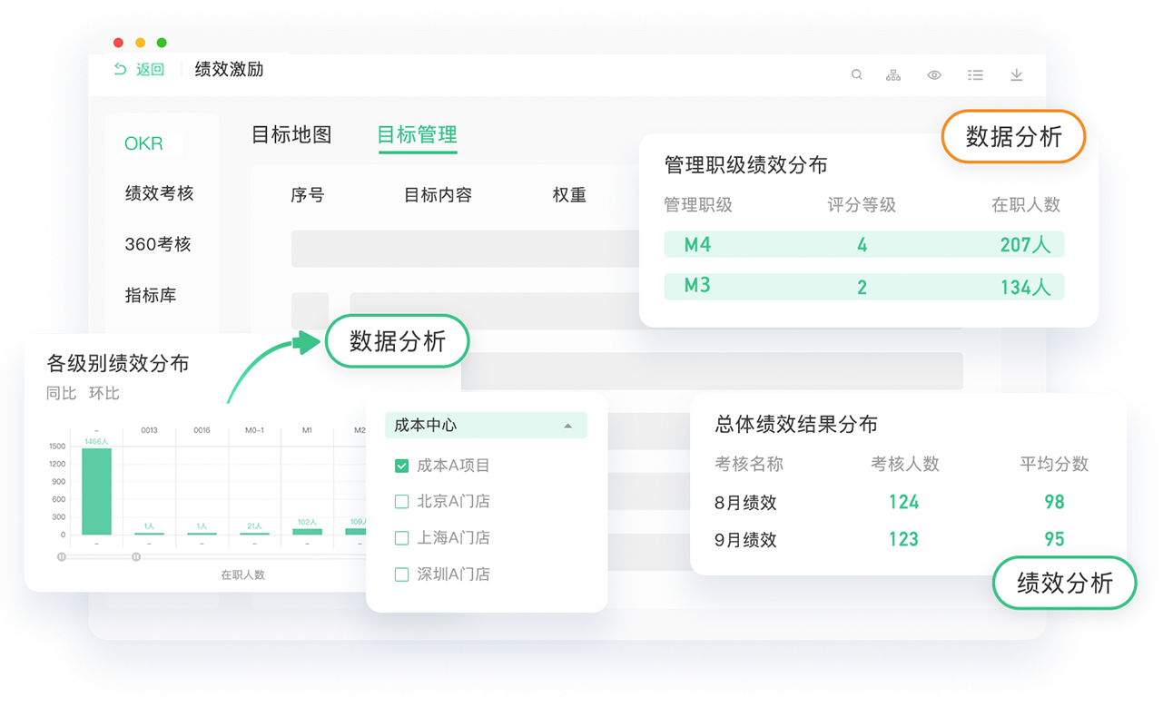 支持KPI、PBC、360等多种绩效管理模式 支持OKR和进度跟踪,让目标可衡量可实现;实时跟踪/预警/反馈,助力绩效过程把控;绩效结果同步薪酬,工资/晋升有据可依