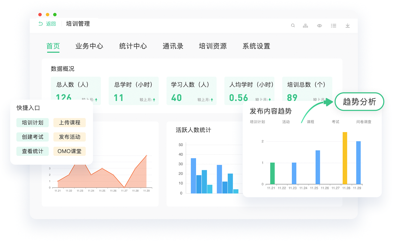 综合数据看板,课程效果反馈,员工能力分析,组织架构
