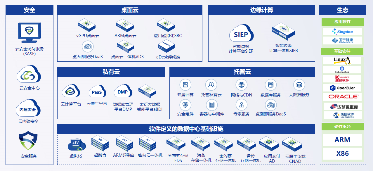 信服云不仅拥有自研的基础架构软件,还广泛兼容国内的软、硬件生态,可以为用户提供关键系统全栈自研的IT基础设施国产化解决方案。
